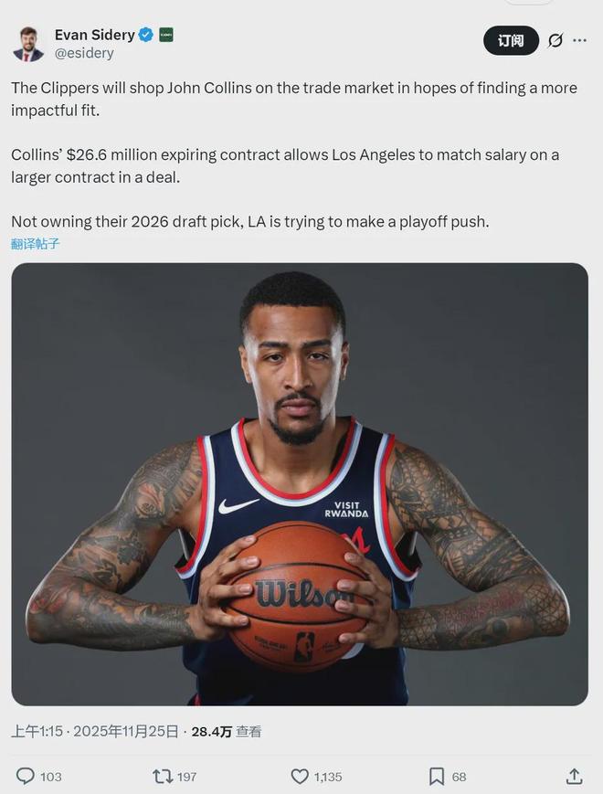北京时间11月25日,据福克斯体育记者Evan Sidery报道,快船将把约翰-科林斯摆上货架,寻求交易更适合快船的球员,科林斯的合同还剩1年2660万美元。快船不会摆烂、仍然要冲击季后赛,因为快船2026年首轮签在雷霆手里。